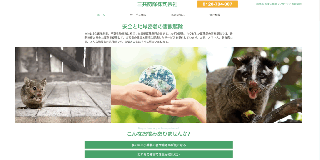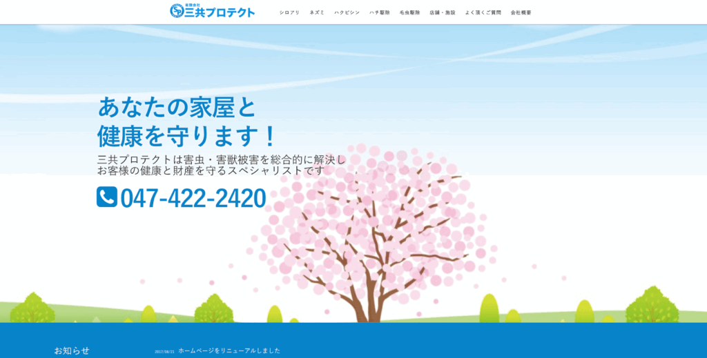 「三共プロテクト」は船橋市に事務所をもつ地域密着の駆除業者です。ネズミ・ハクビシン駆除からシロアリや害虫防除まで幅広く対応しています。新築消毒やリフォームも行っており、地域に根ざした迅速・丁寧な施工が特徴です。