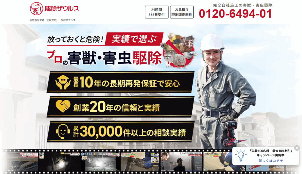 「駆除ザウルス」は24時間受付による早急な対応が可能な害獣駆除業者です。テレビ取材を多数受けており、累計3万件を超える駆除実績があります。完全自社施工が強みで、長期保証制度など実績重視のサービスが特長です。全国対応ながら地域ごとの特性に合わせた柔軟な駆除プランを提案しています。