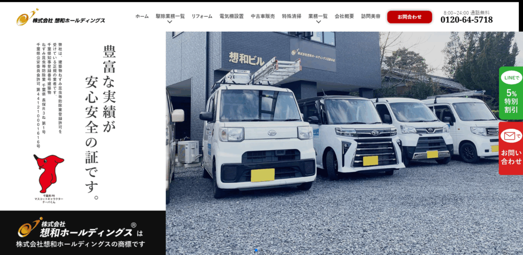 「株式会社想和ホールディングス」は千葉県茂原市に本社を置く総合駆除業者です。完全自社施工のアフターフォローを徹底し、「見積り・調査は無料で追加費用なし」を徹底しています。累計3万件超の実績を持ち、最長「永久」保証を掲げるなど再発防止に強みを持っています。千葉県を中心に関東一円へ迅速に駆けつけ、地域に根ざしたきめ細やかな対応を行っています。