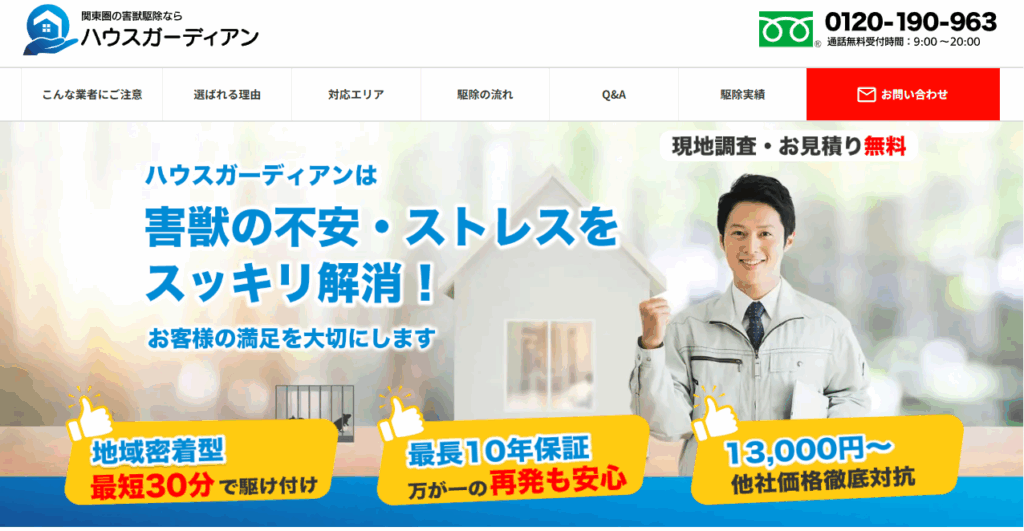 「ハウスガーディアン」は関東エリアで害獣駆除を行う専門業者です。現地調査・見積もりは完全無料で、年間施工実績は10,000件以上です。24時間受付が可能で、完全自社施工による再発防止にこだわった確実な駆除と長期保証が特長です。地域の住宅事情を熟知し、迅速かつ誠実な対応で信頼を集めています。