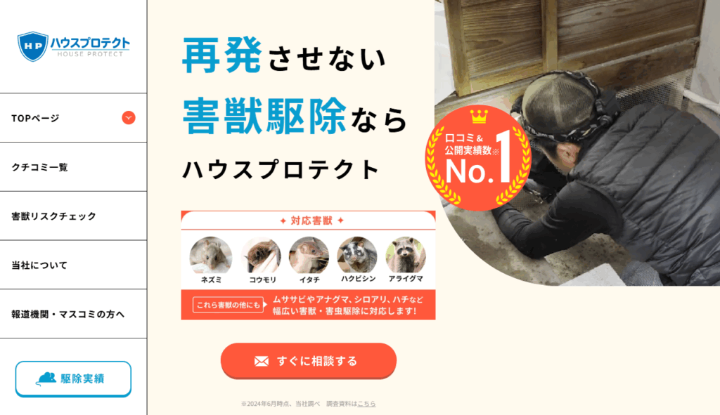 「ハウスプロテクト」は”再発させない駆除”を掲げる全国展開の害獣駆除業者です。害獣・害虫駆除サービスの依頼を24時間365日受け付けています。完全自社施工による迅速・丁寧な対応が強みで、施工後の再発保証も充実しています。現地調査や見積もりを無料で行い、状況に合わせた最適な駆除プランの提案が可能です。