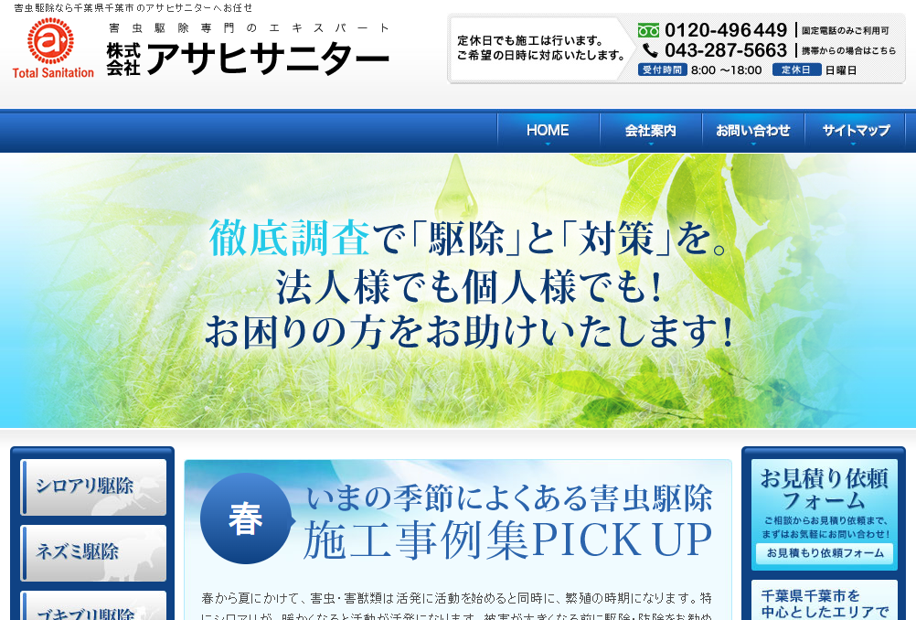 「アサヒサニター」は千葉市に本社を置く害虫・害獣駆除の専門業者です。昭和59年創業の老舗で、長年蓄積したノウハウで確実な施工を行います。住宅だけでなくビル・施設・店舗にも対応し、専門的な機器・技術を用いた駆除・防除で顧客の安全な環境維持を支援します。
