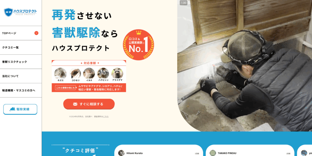 「ハウスプロテクト」は全国各地で害獣駆除を行う専門業者です。口コミでの評価が高く、全社平均は4.7にのぼります(2024年6月時点)。「再発防止」を重要視しており、自社開発の薬剤を使った害獣駆除が強みです。リフォーム会社が母体のため、駆除の知識だけでなく、施工技術にも自信を持っています。