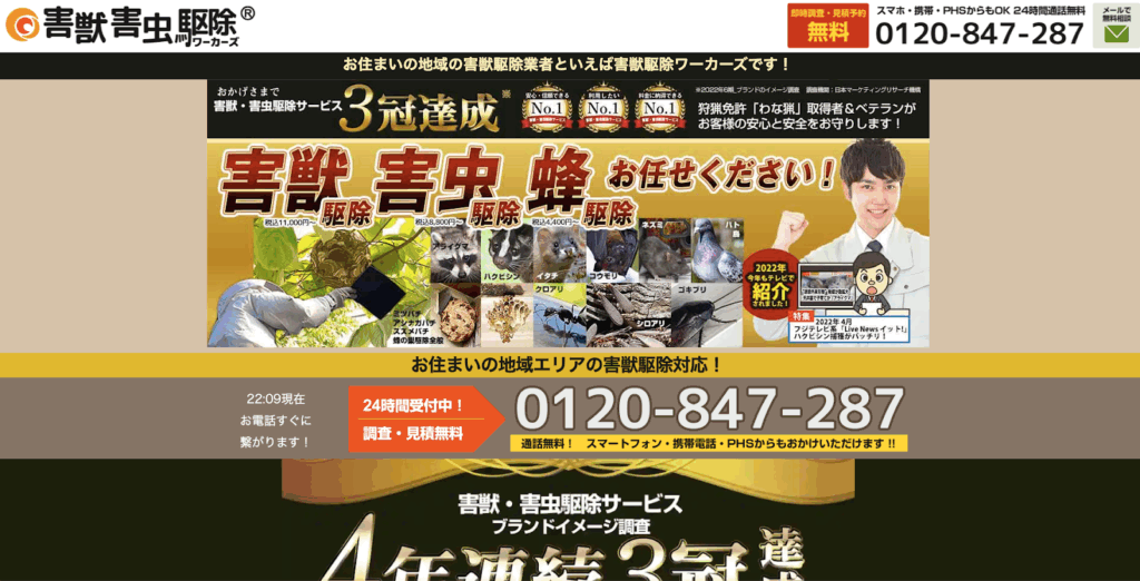 「害獣害虫駆除ワーカーズ」は日本各地で害獣駆除を行っている専門業者です。相談実績は40,000件にのぼります。「基本料金+作業料金」という分かりやすい料金設計になっており、無料調査と見積もりのあとに納得できたら作業に入ります。再発率は0.3%で、万が一再発した際には責任を持って対応してくれます。