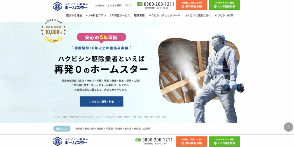 「ホームスター」は1999年の設立以来10,000件以上の実績をもつ害獣駆除業者です。国家資格である「厚生労働大臣指定防除作業監督者」を保有する有資格者が調査から駆除を行っており、再発件数はゼロです。くらしのマーケットにおける「ハクビシン・アライグマ・イタチ駆除」サービスでの口コミ数もNo.1(2020年10月時点)と実際に評価もされています。