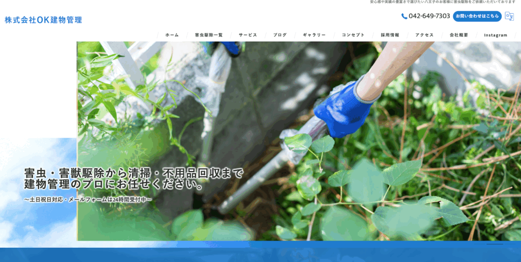 「株式会社OK建物管理」は八王子市を中心に害獣駆除や清掃・不用品回収を行う地元密着の業者です。土日祝日の依頼にも対応するほか、メールフォームでの問い合わせは24時間受け付けています。シロアリやハチの駆除以外にも、大切な住宅を空き巣などから守る防犯カメラシステムの構築や、リフォームなどのご相談も可能です。