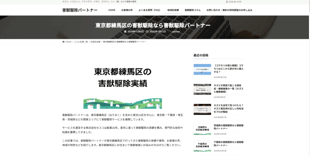 「害獣駆除パートナー」は東京、千葉、埼玉、茨城に密着した害獣駆除業者です。大手ホームセンターとの提携やペストコントロール協会との連携により、練馬区内でも多くの害虫・害獣駆除工事を行っています。公式サイトでは2024年12月時点での練馬区内のエリア別の駆除実績を公開しています。