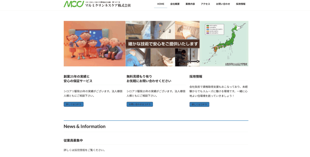 「マルミクリンネスケア株式会社」は建造物や生活環境に寄生する各種害虫や害獣、細菌のコントロールをトータルで行う会社です。薬剤、専用設備機器、改善工事を駆使し、総合的に環境を改善していきます。問い合わせはメール・電話・FAXで受け付けています。