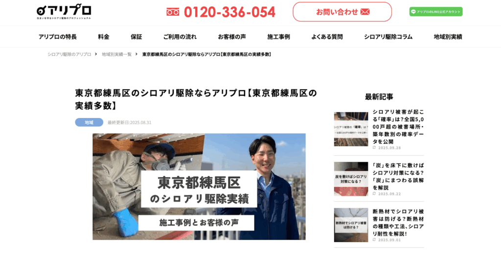 「アリプロ」は練馬区を含む23区を中心に、千葉県、埼玉県、茨城県などの関東エリアでシロアリ駆除サービスを行う専門業者です。地域密着でシロアリ・羽アリ駆除を徹底的にサポートします。日本しろあり対策協会が認定する「しろあり防除施工士」の資格を保有するスタッフのみが点検を行うため信頼できます。