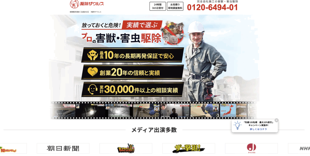 「駆除ザウルス」は日本全国に対応する害獣駆除の専門業者です。すべての作業を自社スタッフが行う完全自社施工が強みです。駆除資格や衛生管理の有資格者も多数在籍しています。駆除の依頼は電話・メール・LINEから相談可能です。