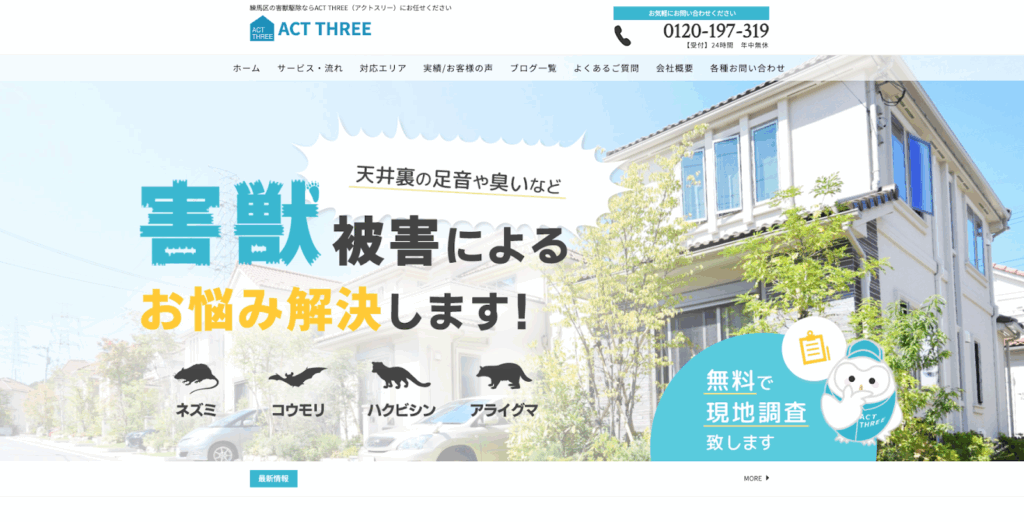 「アクトスリー」は心から安心して暮らせる環境のために東京都内の拠点を中心に活動する害獣駆除業者です。現地調査を行ったスタッフが一貫して工事に対応するため安心できます。再発に悩むことが無いように現地調査を徹底し今後を見据えたプランを提案します。