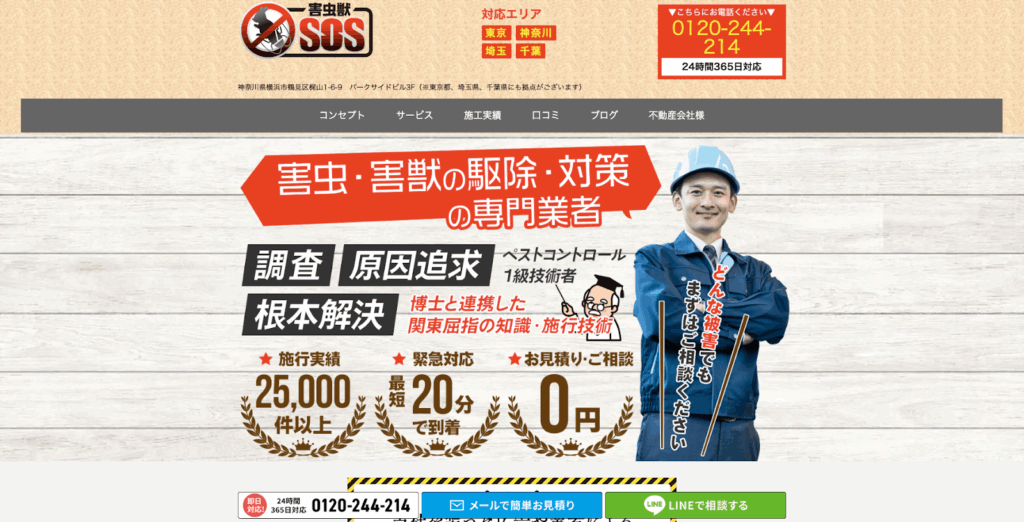 「害虫獣SOS」は関東エリアで害獣・害虫駆除を行う専門業者です。業界最安値の5,000円から依頼を受けており、最短20分で駆けつけます。2回目以降の依頼は割引になる制度を実施しており、引越しに伴う駆除・防除対策の依頼などでのリピーターも頼みやすくなっています。