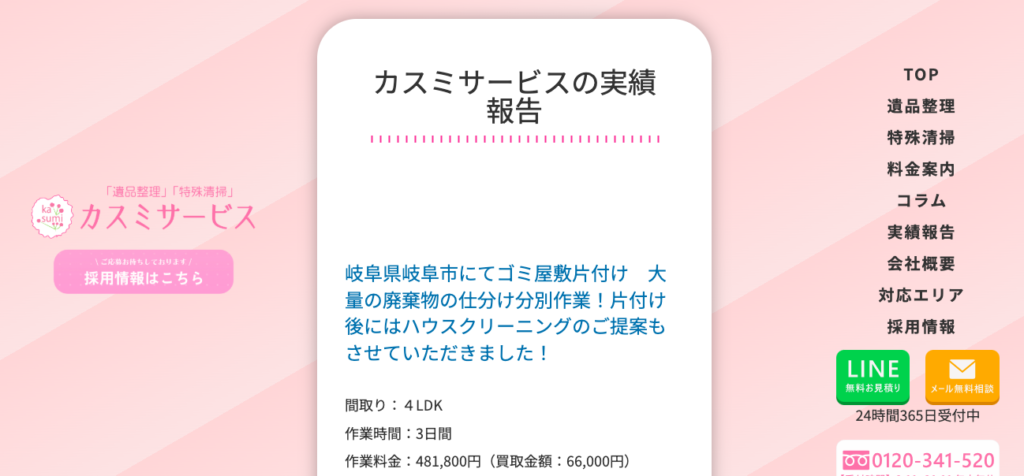 東海地方を中心にサービスを提供しているゴミ屋敷片付け業者です。料金が定額パックでわかりやすく、初心者でも安心して利用できます。パック内には作業費や車両費も全て含まれているため、複雑な追加料金もありません。
