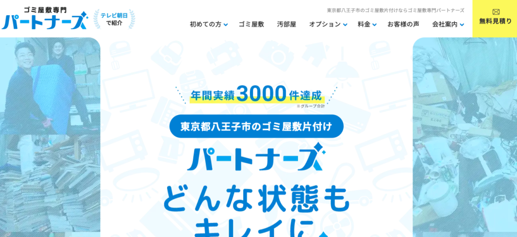 テレビ朝日やテレビ大阪など、多くのメディアに取り上げられている、知名度の高いゴミ屋敷片付け業者です。年間実績3,000件を達成しており、人気と実力の両方を兼ね備えています。